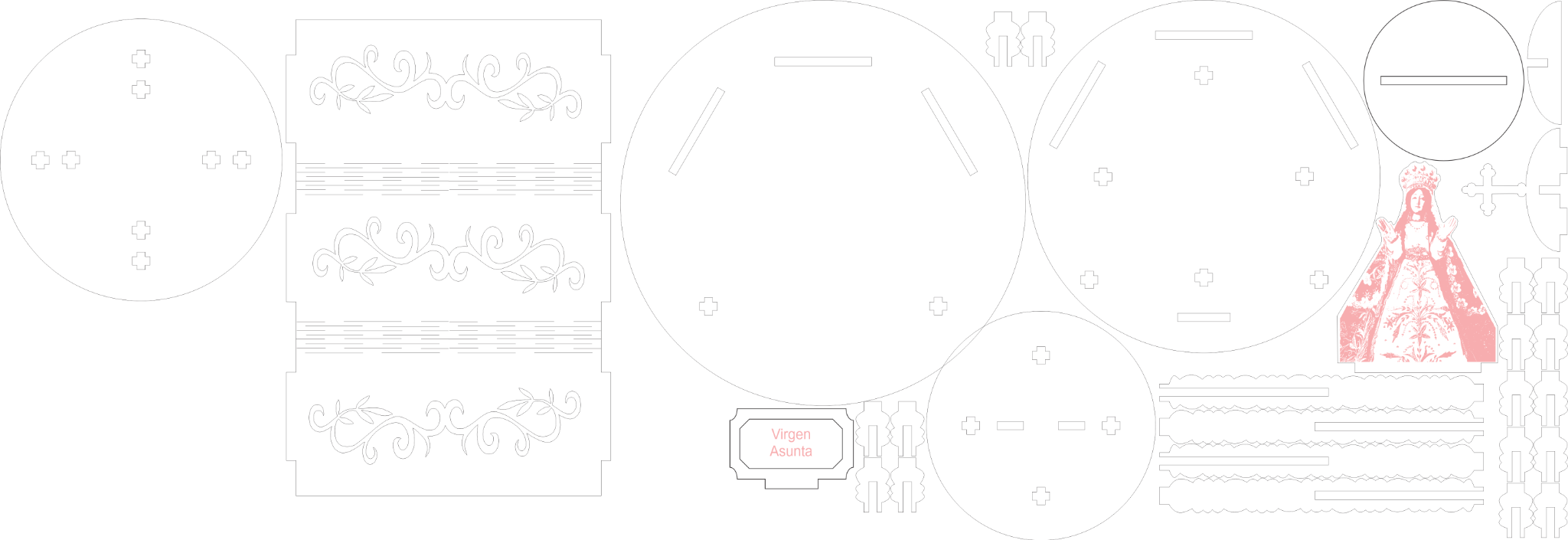 Este proyecto consiste en la creación de una maqueta tridimensional de una capilla en miniatura, cuya figura central representa a la Virgen Asunta, una devoción muy arraigada en diversas comunidades religiosas. La pieza fue diseñada digitalmente y elaborada con tecnología de corte y grabado láser en MDF de 3 mm, permitiendo un acabado detallado y preciso.