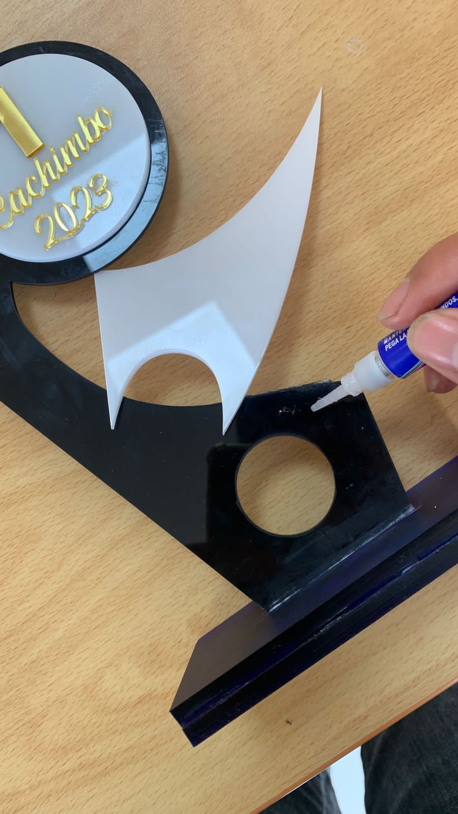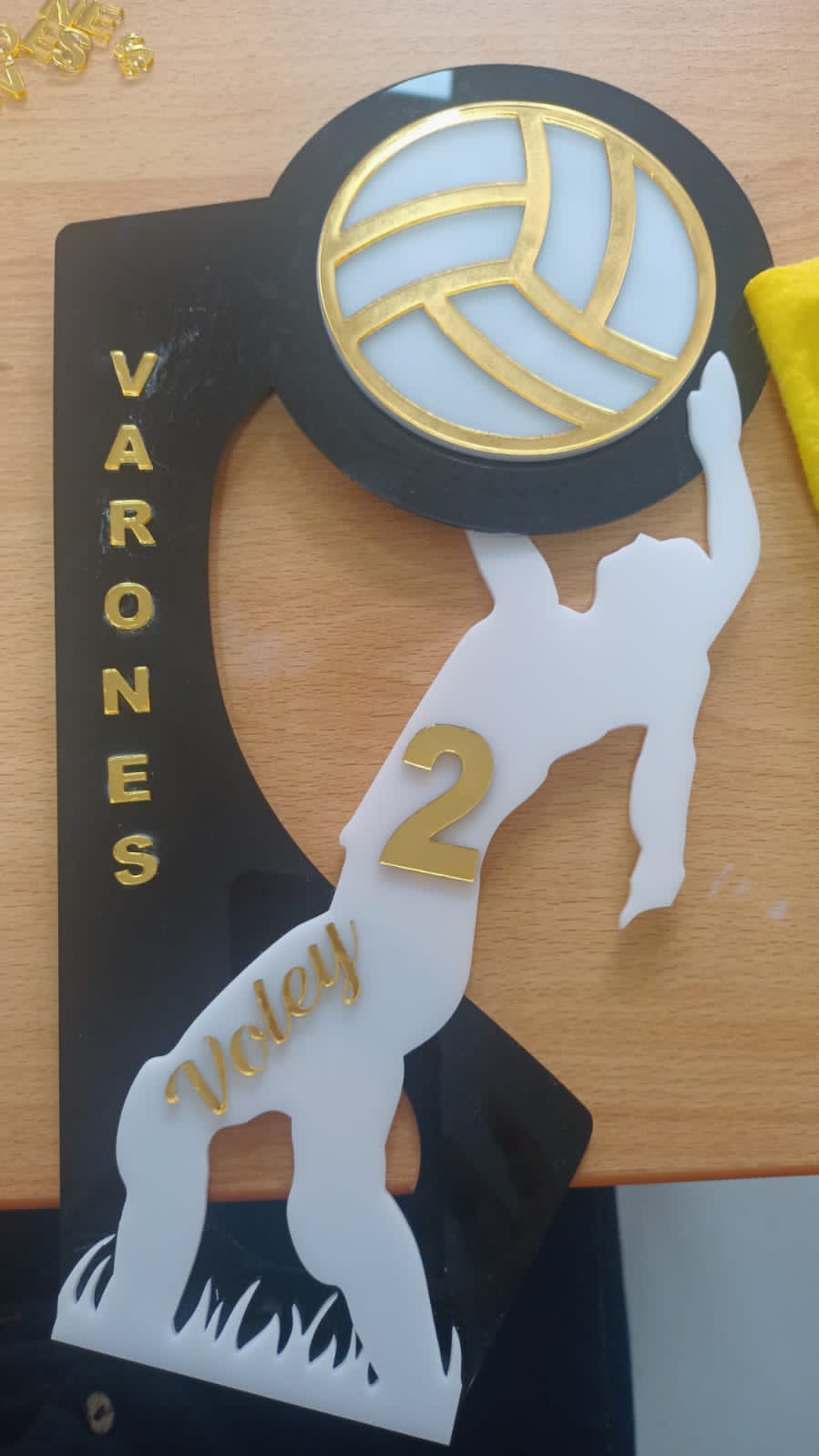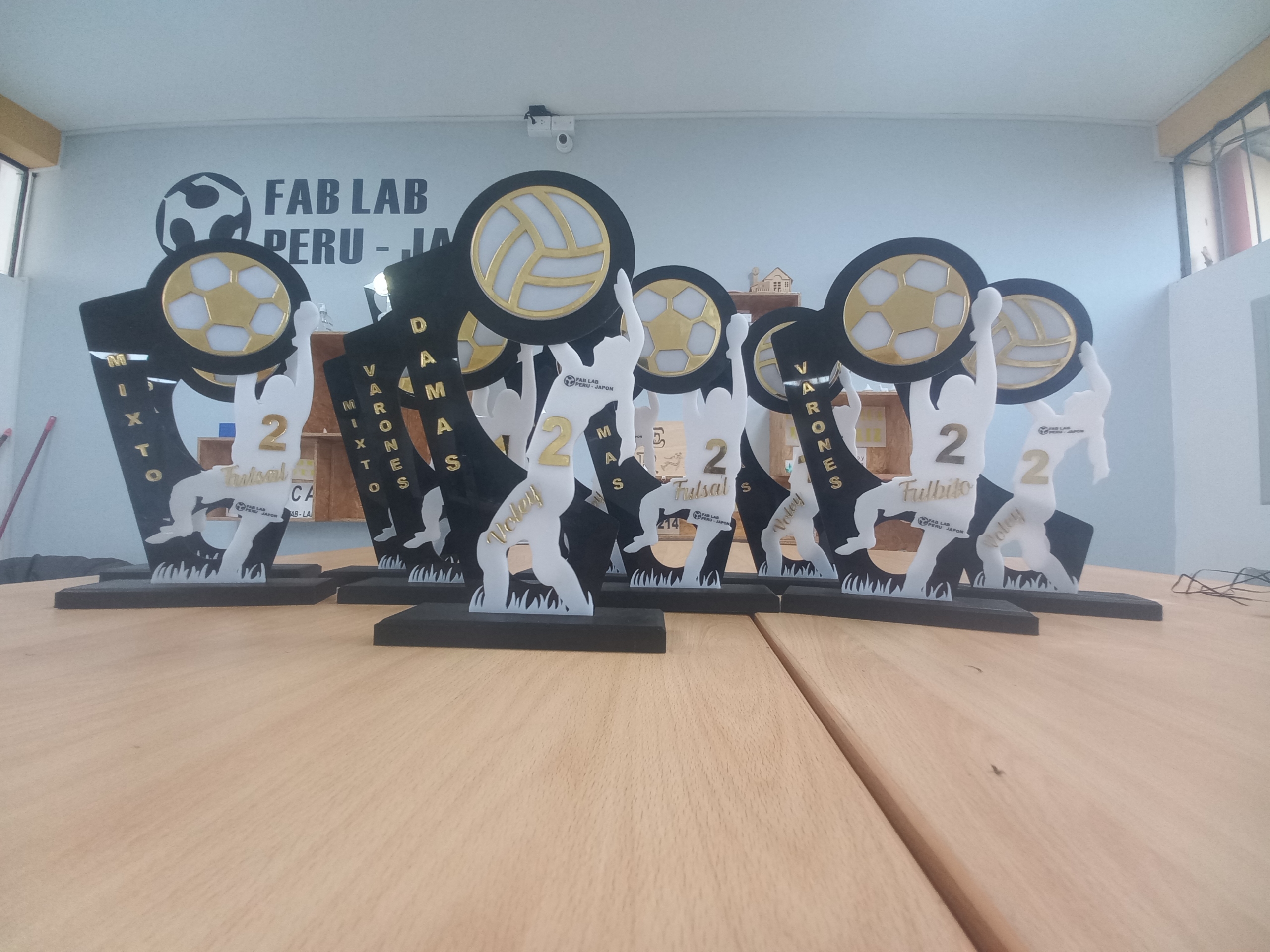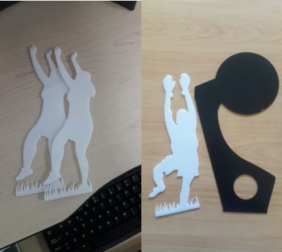 Siluetas en acrílico de 2mm, de color negro para el fondo del trofeo y en acrílico blanco de 3mm, las siluetas de los deportistas. Así mismo las siluetas de los balones de deporte hechos en acrílico negro y dorado. 27-Apr-2023